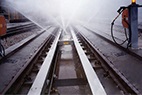 高速動車組列車在高速行駛中帶起的雪花結(jié)成了冰,附著在列車地盤上,這些冰層會影響機械師對列車地盤的檢查,對行車安全帶來隱患。因此在檢修前,機械師們先要把列車地盤和輪軸上的冰清除干凈。這些冰大多聚集在地盤零件的空隙里,凍的非常結(jié)實,要想把它們處理干凈,傳統(tǒng)的方法是用特制的工具,一點點往下鏟。為此,北京德高潔清潔設(shè)備有限公司組織技術(shù)力量,研發(fā)了一款全自動高速動車組列車底盤、輪軸除冰系統(tǒng)。