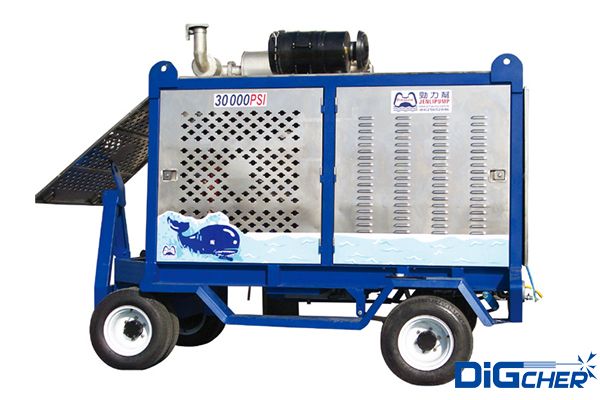 德高潔 DJ 2000/20DT 2000公斤壓力進口柴油超高壓清洗機采用康明斯95kw柴油發(fā)動機作為動力源,高壓泵為美國原裝三柱塞泵,設(shè)計有三級進水過濾器,并采用特種不銹鋼泵頭、不銹鋼閥門及柱塞、高技術(shù)密封填料;曲軸箱采用飛濺潤滑;設(shè)計有變頻調(diào)速系統(tǒng);配備氣動旋轉(zhuǎn)槍;安全閥采用爆破膜式,安全可靠。