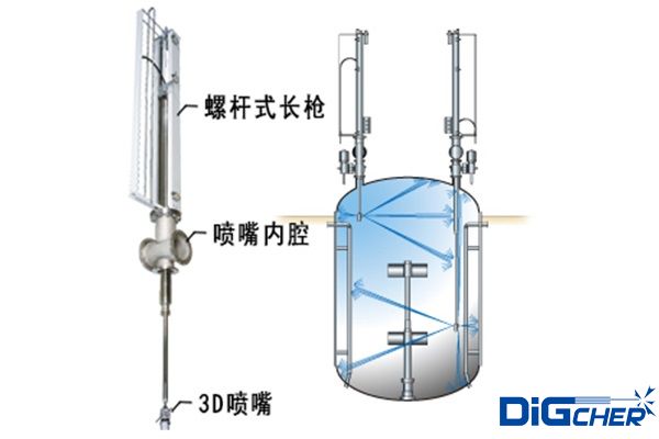 德高潔全自動(dòng)不銹鋼反應(yīng)釜清洗系統(tǒng)具體清洗流程是將三維旋轉(zhuǎn)噴頭伸縮機(jī)構(gòu)安裝在反應(yīng)釜入孔上,伸縮桿伸進(jìn)反應(yīng)釜內(nèi),伸縮機(jī)構(gòu)可采用手動(dòng)、電動(dòng)、液壓等控制,伸縮桿在反應(yīng)釜內(nèi)伸縮和沿反應(yīng)釜內(nèi)壁周?chē)较蛞苿?dòng)。根據(jù)具體實(shí)際情況可選用2孔或4孔三維自動(dòng)旋轉(zhuǎn)噴頭,當(dāng)三維自動(dòng)旋轉(zhuǎn)噴頭水平旋轉(zhuǎn)時(shí),水射流形成的旋轉(zhuǎn)力矩帶動(dòng)噴嘴在垂直面內(nèi)旋轉(zhuǎn)。由于三維旋轉(zhuǎn)噴頭與伸縮桿的復(fù)合運(yùn)動(dòng),高壓水射流可以覆蓋反應(yīng)釜內(nèi)任何位置,從而完成反應(yīng)釜的清洗。